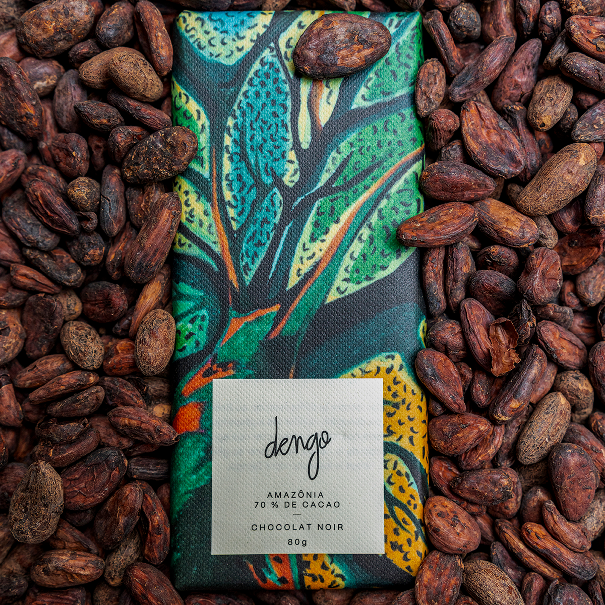 Tablette de chocolat noir 70% cacao d'Amazonie. Récompensées pour la première fois lors d'un concours en 2019, les fèves cultivées par Robson Brogni et Belmiro Faes figurent désormais parmi les pépites du terroir de l'Amazonie. A découvrir sans attendre.