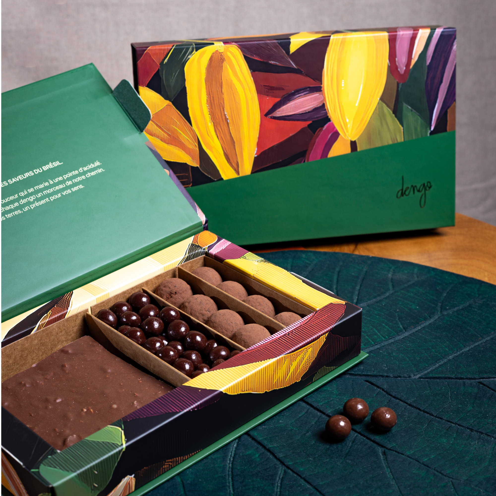 Le Coffret Fruité Dengo réunit le meilleur des chocolats et gourmandises fruitées brésiliennes.