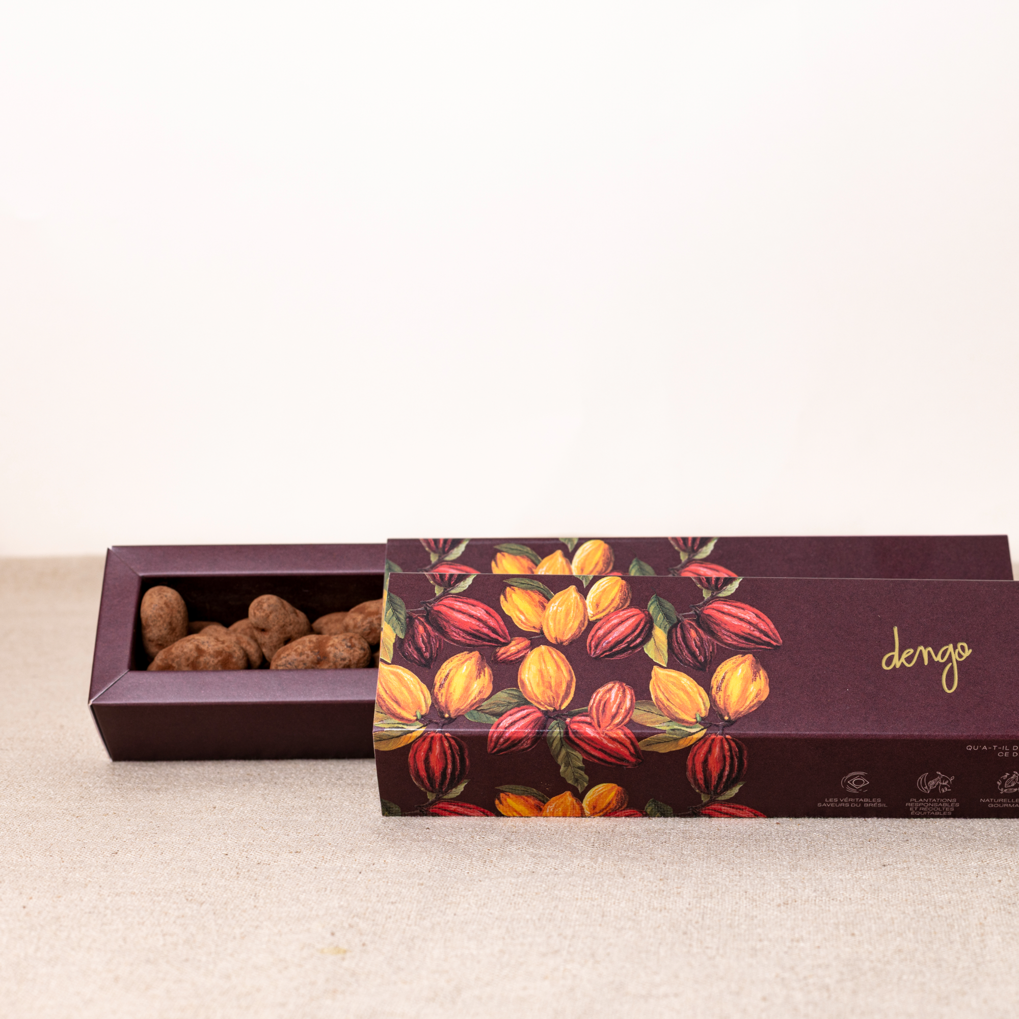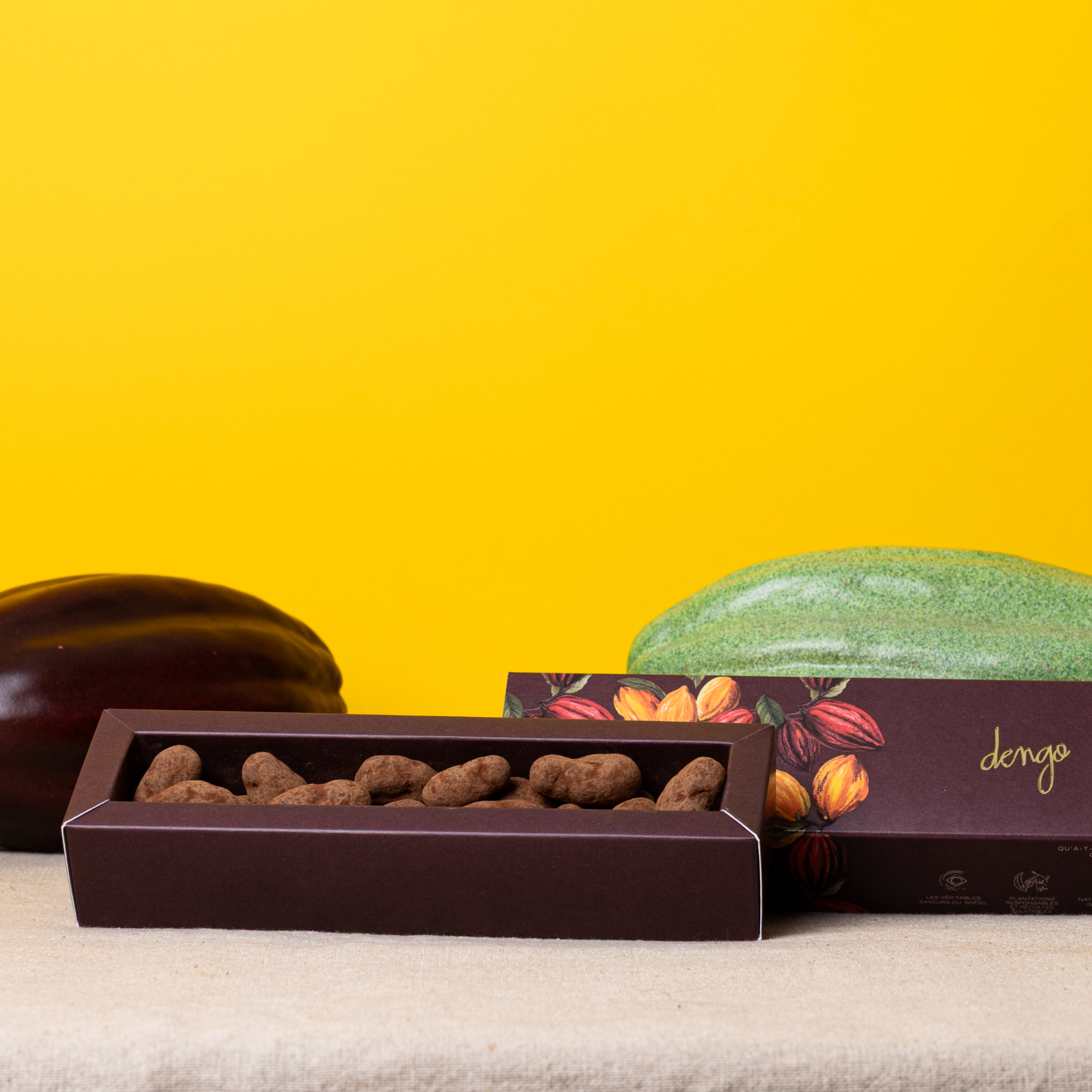 Découvrez les Pépitas Dengo, des fêves sélectionnées à la main, à parfaite maturation, torréfiées, caramélisées et saupoudrées de cacao 65% : un voyage sensoriel 100% cacao.