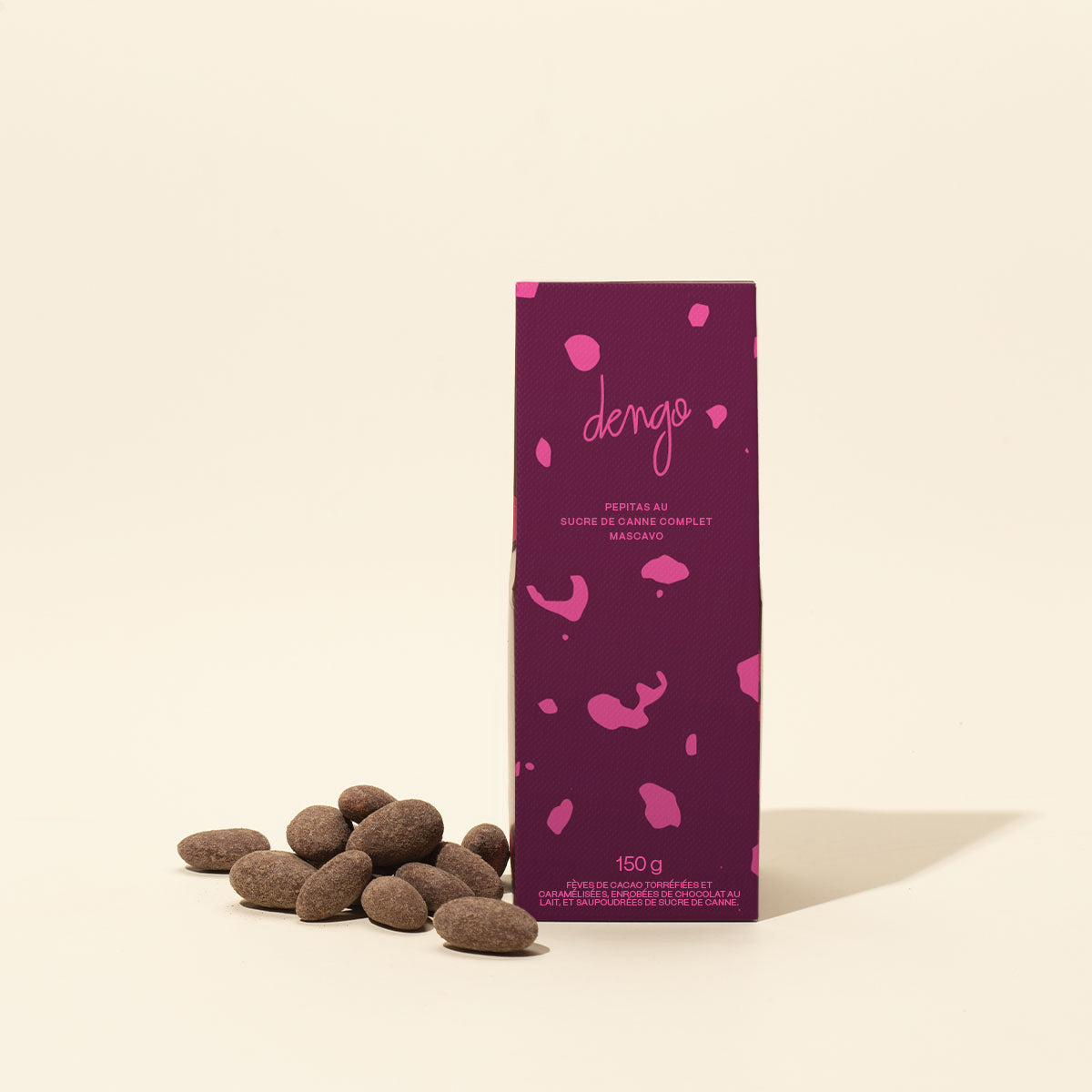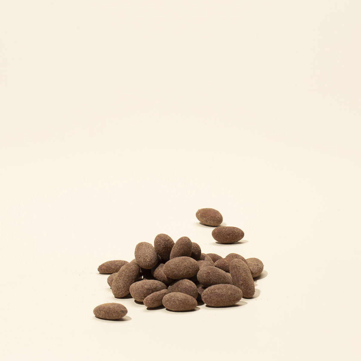Fèves de cacao torréfiées, caramélisées, enrobées de chocolat au lait 50% et sucre muscovado