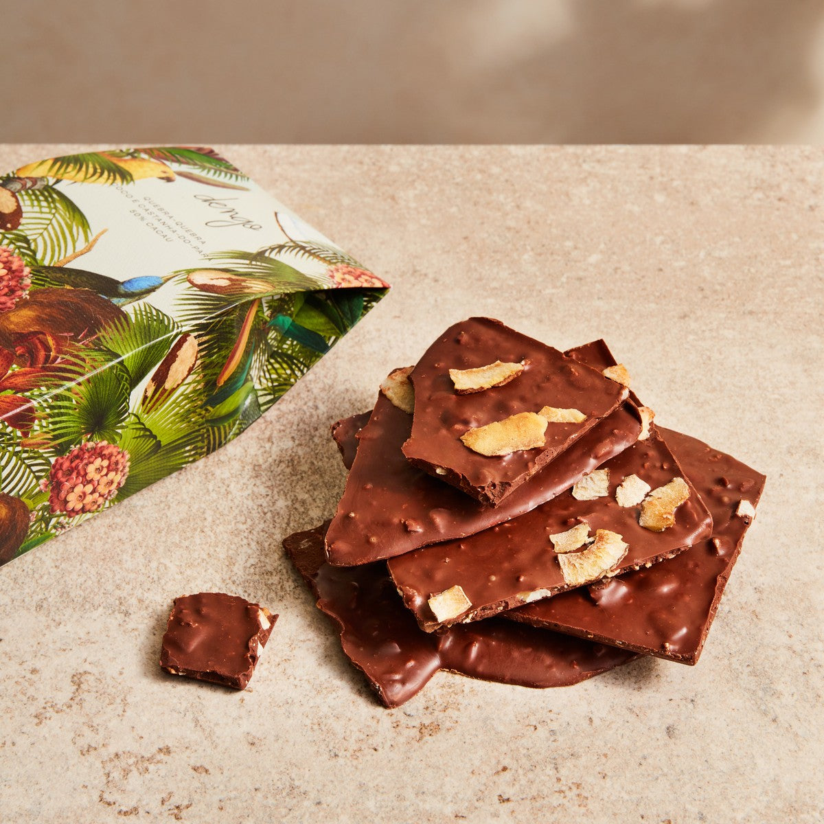 Un accord parfait entre la gourmandise du chocolat au lait 50%, le parfum et le croquant de la noix de coco grillée et de la noix du Brésil.