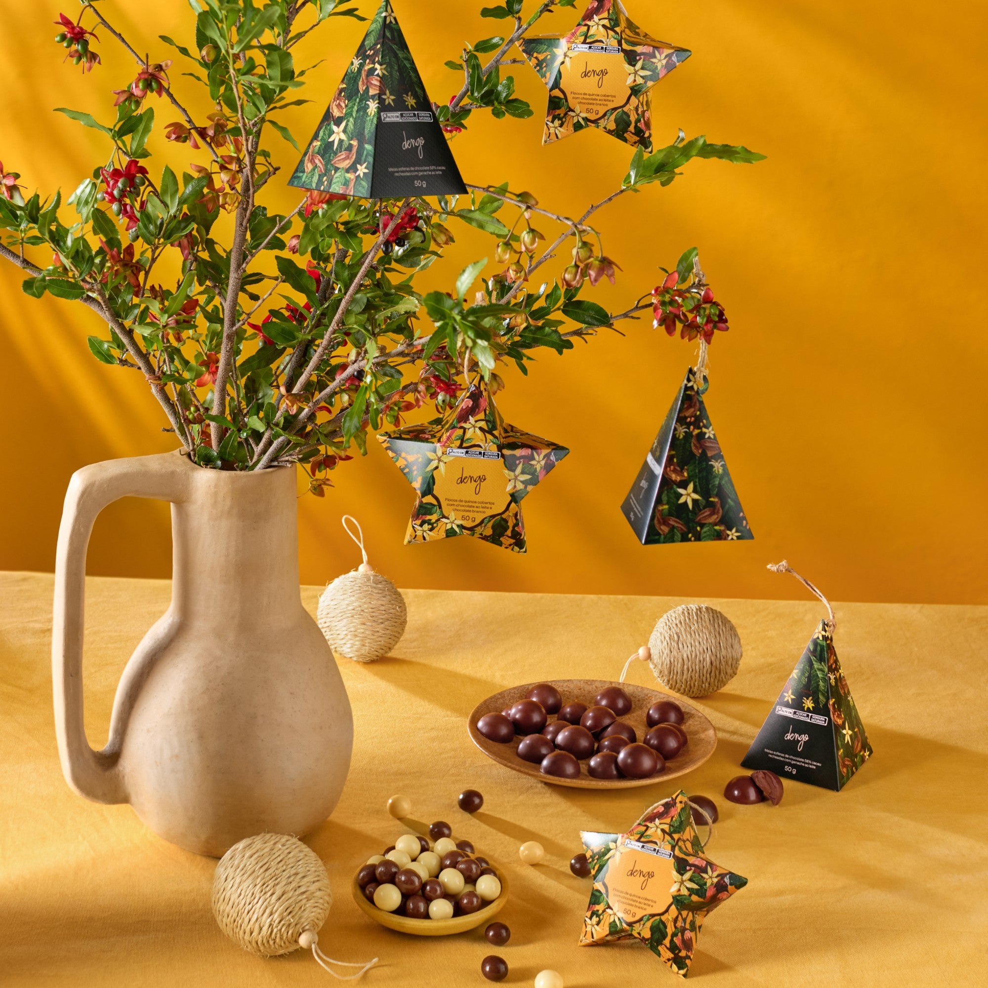 Ces petites billes croquantes offrent une expérience à la fois légère et gourmande. Présentées dans une étoile, elles peuvent directement être accrochées aux branches du sapin pour ajouter une touche festive et chocolatée à votre décoration.